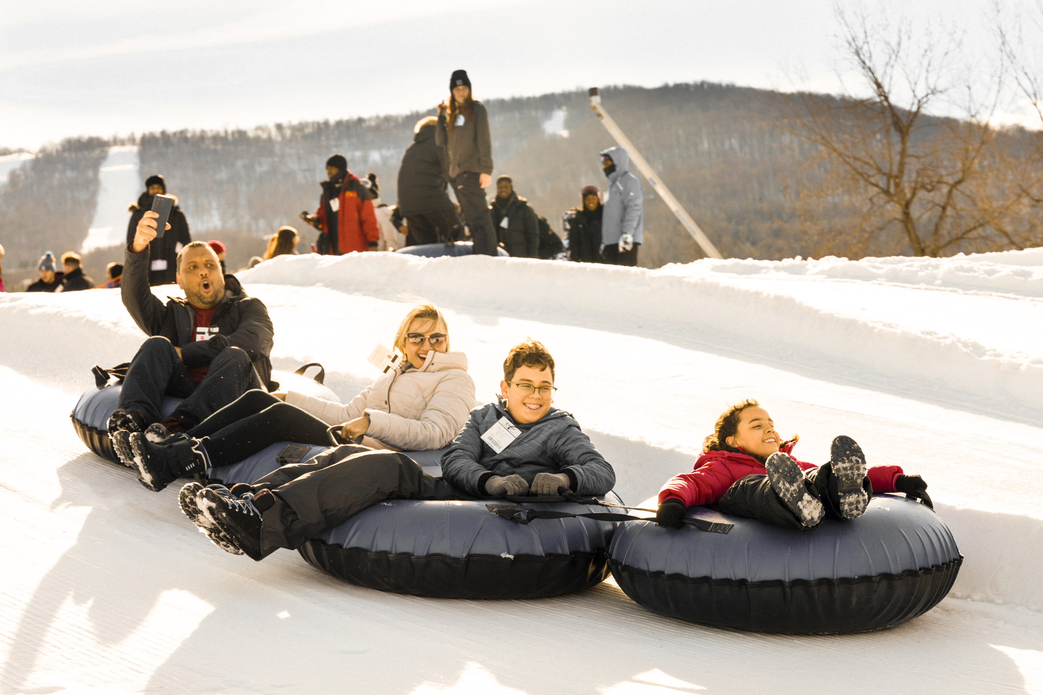 The Snow Tubing Park at Windham Mountain Club offers thrilling descents for family and friends. Come for the day or stay for nighttime magic under the lights, with illuminated evening sessions featuring dance-worthy music. Get whisked to the top by our magic carpet for repeat fun again and again. A rustic, cozy lodge provides a warm place to recharge and refuel indoors or around a firepit.